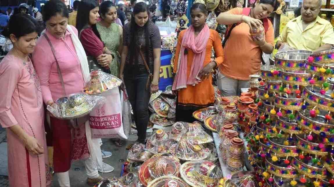 Karwachauth News : करवाचौथ की रौनक से सजा बाजार, बंधेज की साड़ियों और चांदी के करवों का क्रेज़